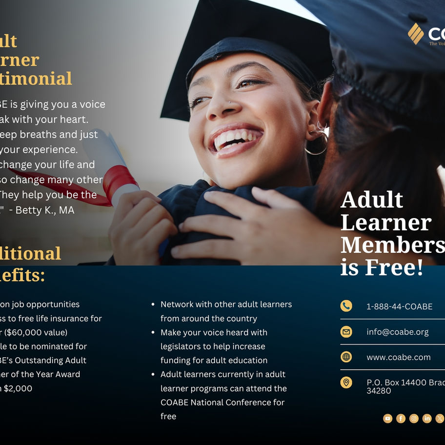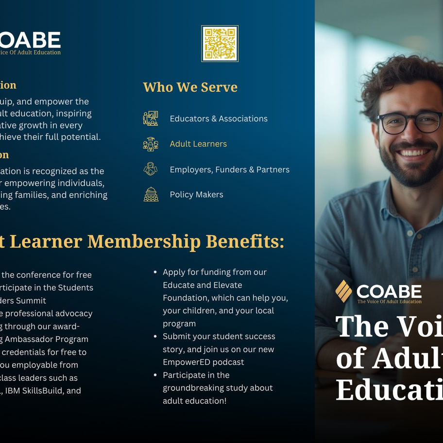 Full color trifold brochure highlighting the many benefits COABE offers adult learners who are COABE members.